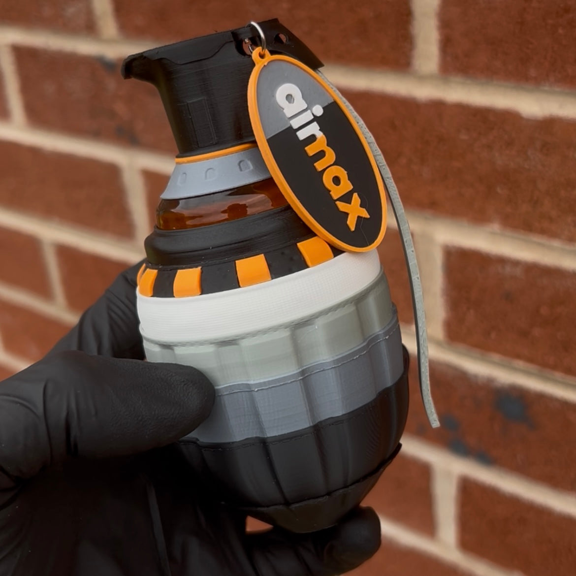 Each grenade is crafted from 25 assembled parts, featuring an epoxy resin bubble and a hanging Airmax logo. Clear-coated for protection. Approximately 24 hours go into every piece.