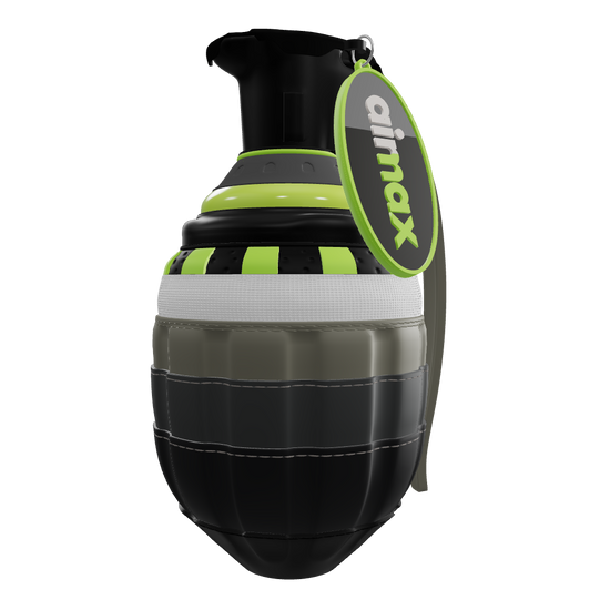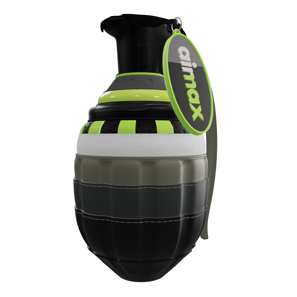 Each grenade is crafted from 25 assembled parts, featuring an epoxy resin bubble and a hanging Airmax logo. Clear-coated for protection. Approximately 24 hours go into every piece,