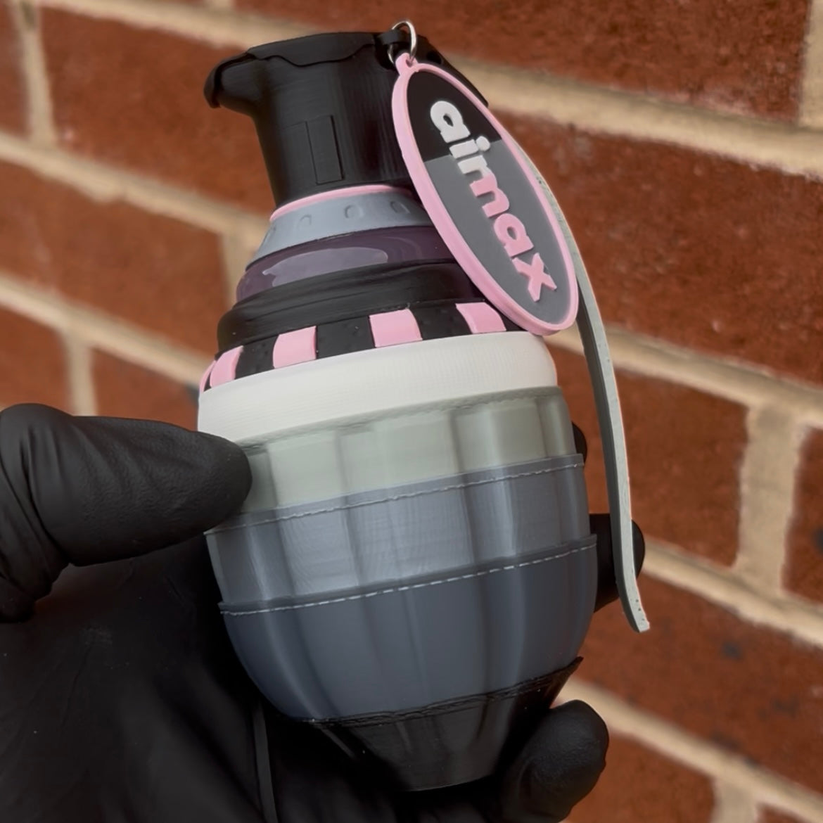 Each grenade is crafted from 25 assembled parts, featuring an epoxy resin bubble and a hanging Airmax logo. Clear-coated for protection. Approximately 24 hours go into every piece.