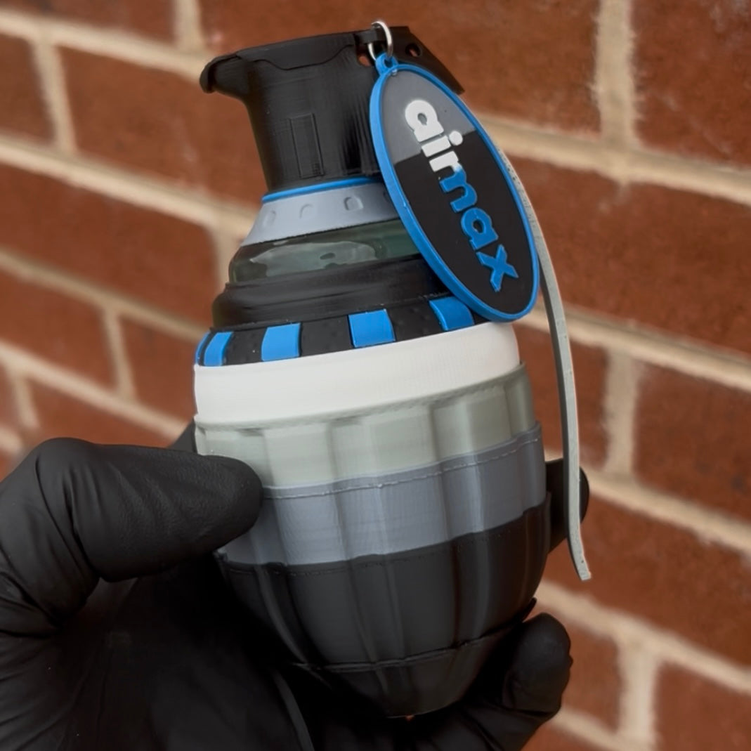 Each grenade is crafted from 25 assembled parts, featuring an epoxy resin bubble and a hanging Airmax logo. Clear-coated for protection. Approximately 24 hours go into every piece.